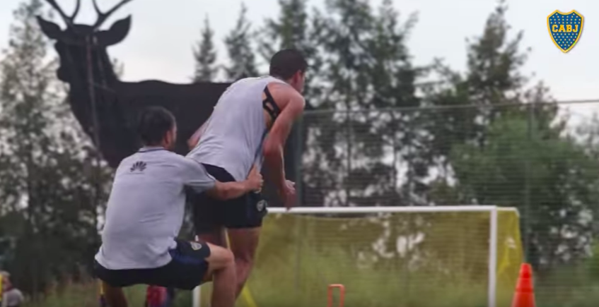 特殊な器具を使用し、上半身に背後へ引っ張る負荷がかかった状態でスプリントを行います。